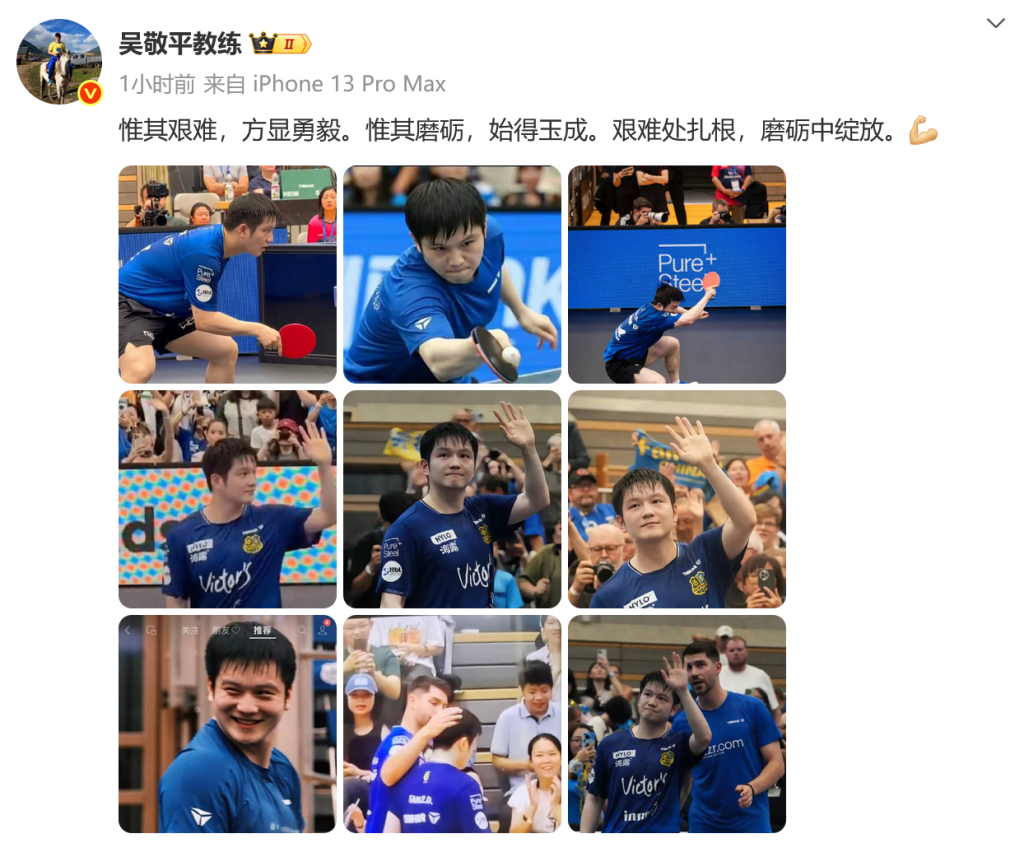 吴敬平再次晒照勉励樊振东。北京时间9月4日,樊振东的前教练吴敬平更新了社交媒体,晒出多张樊振东的照片,为德甲首秀失利的他鼓劲打气。吴敬平教练在社媒上这样写道:“惟其艰难,方显勇毅。惟其磨砺,始得玉成。艰难处扎根,磨砺中绽放。”这并非吴敬平首次公开支持樊振东。上周末,樊振东在自己的德甲首秀中两次登场,先是在首盘单打比赛中2比3不敌罗曼·鲁伊兹,随后又在第四盘比...